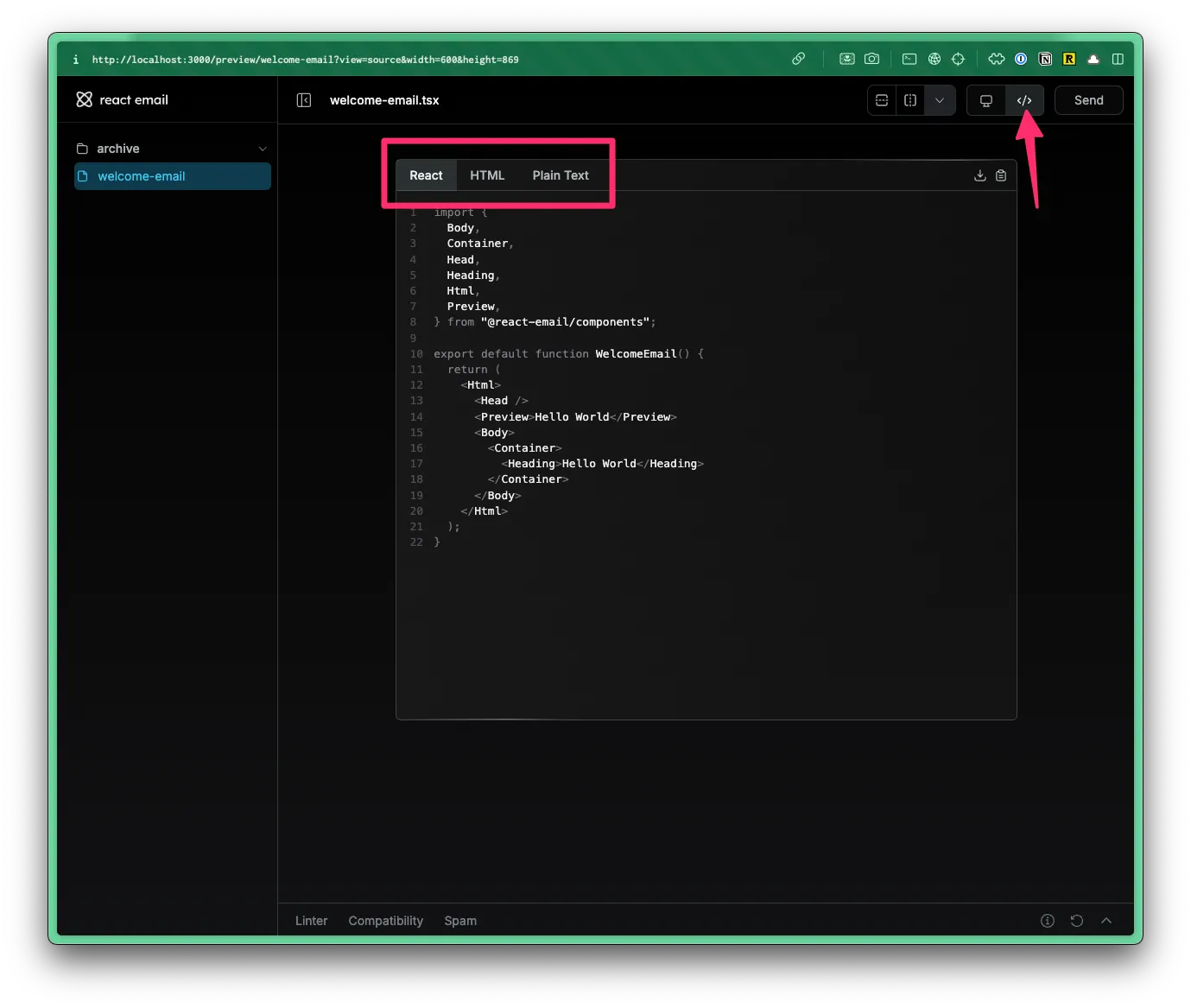 When you’ve finished building the email template, you can get the code by clicking on the Code button in the browser preview.
