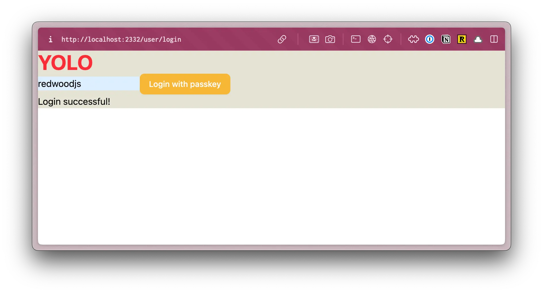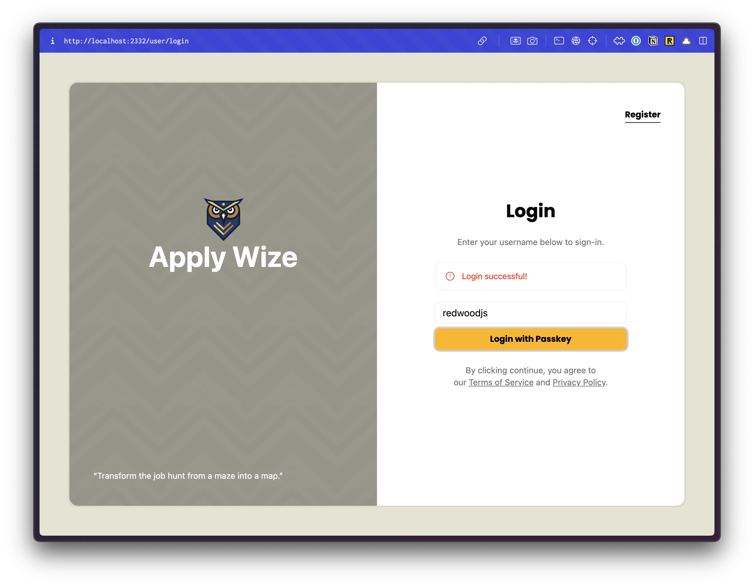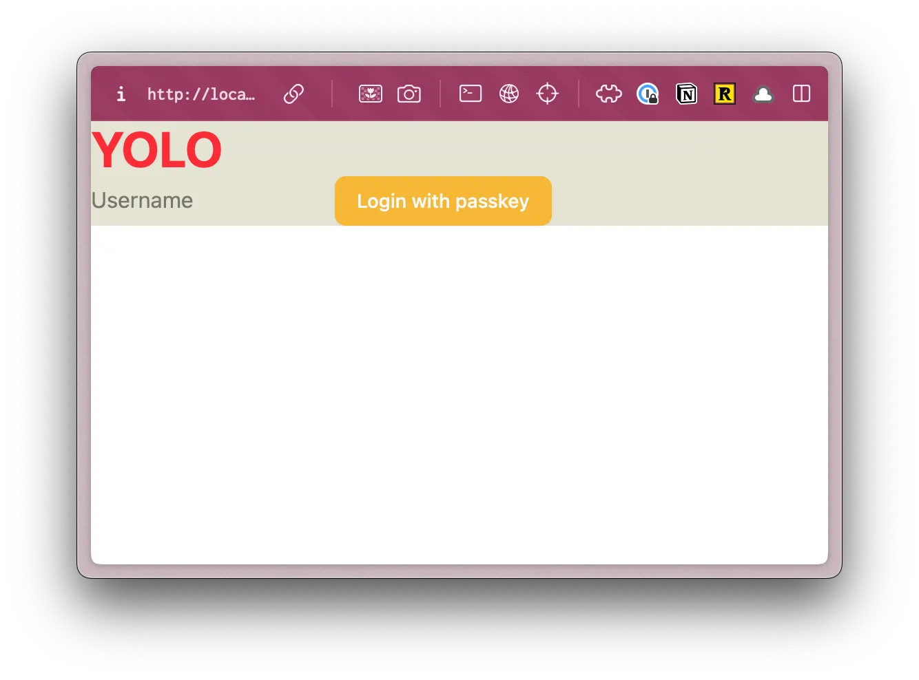 <div className="absolute top-0 right-0 p-10"> <a href={link("/user/login")} className="font-display font-bold text-black text-sm underline underline-offset-8 hover:decoration-primary" > Login </a> </div> <input type="text" value={username} onChange={(e) => setUsername(e.target.value)} placeholder="Username" /> <Button onClick={handlePerformPasskeyRegister} disabled={isPending}> {isPending ? <>...</> : "Register with passkey"} </Button> {result && <div>{result}</div>} </div> </main> );- We're using the same styles as our login page.
