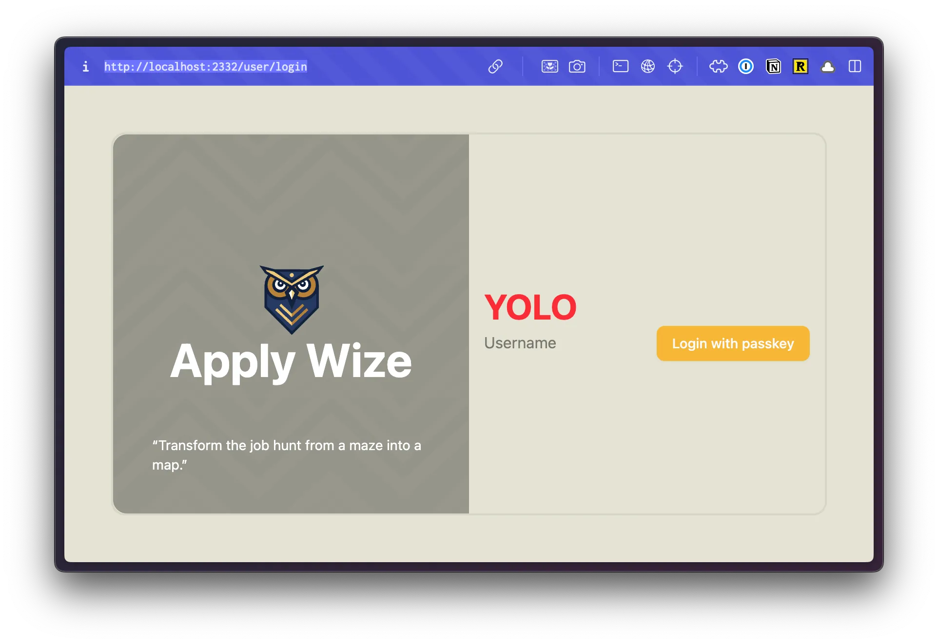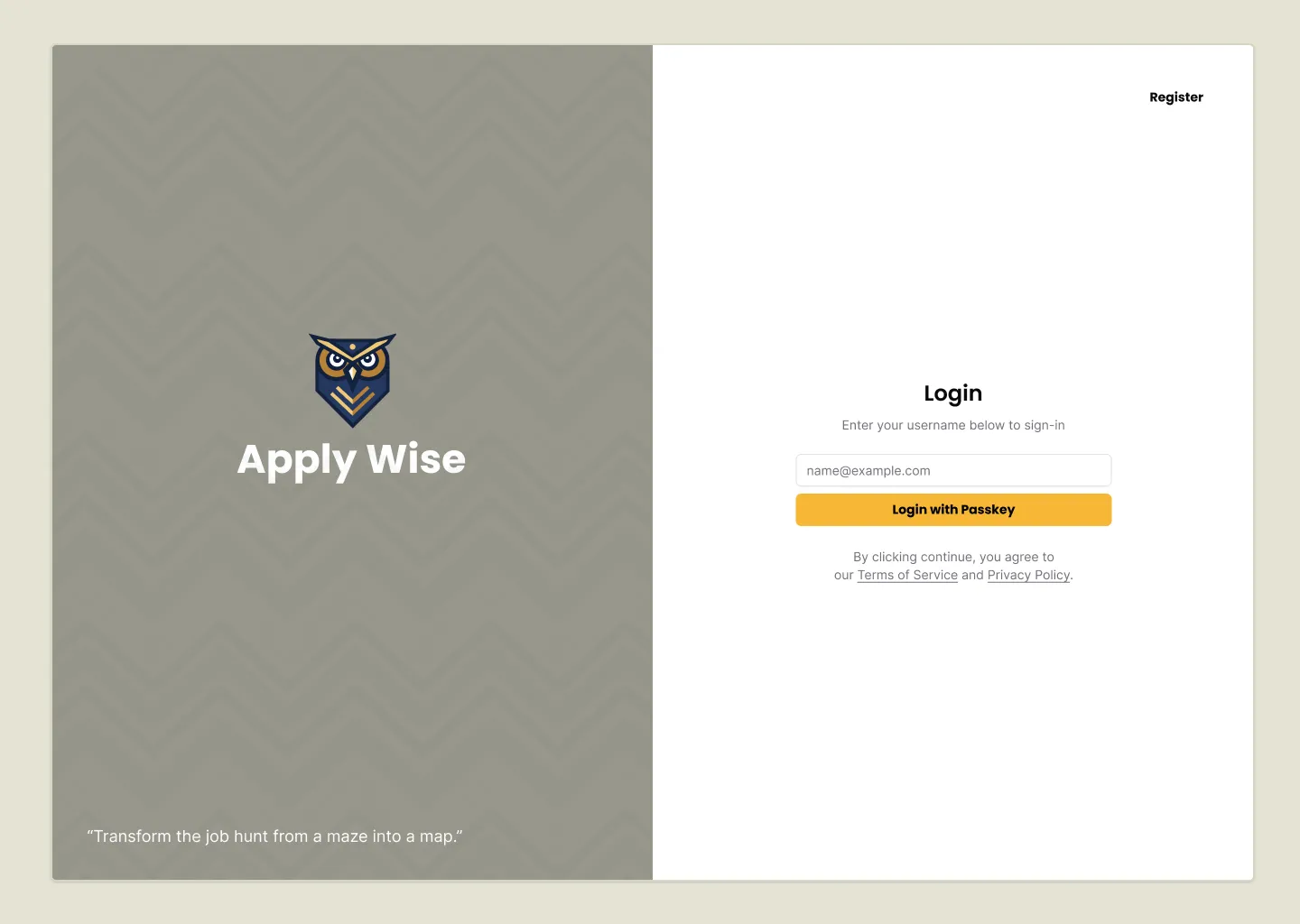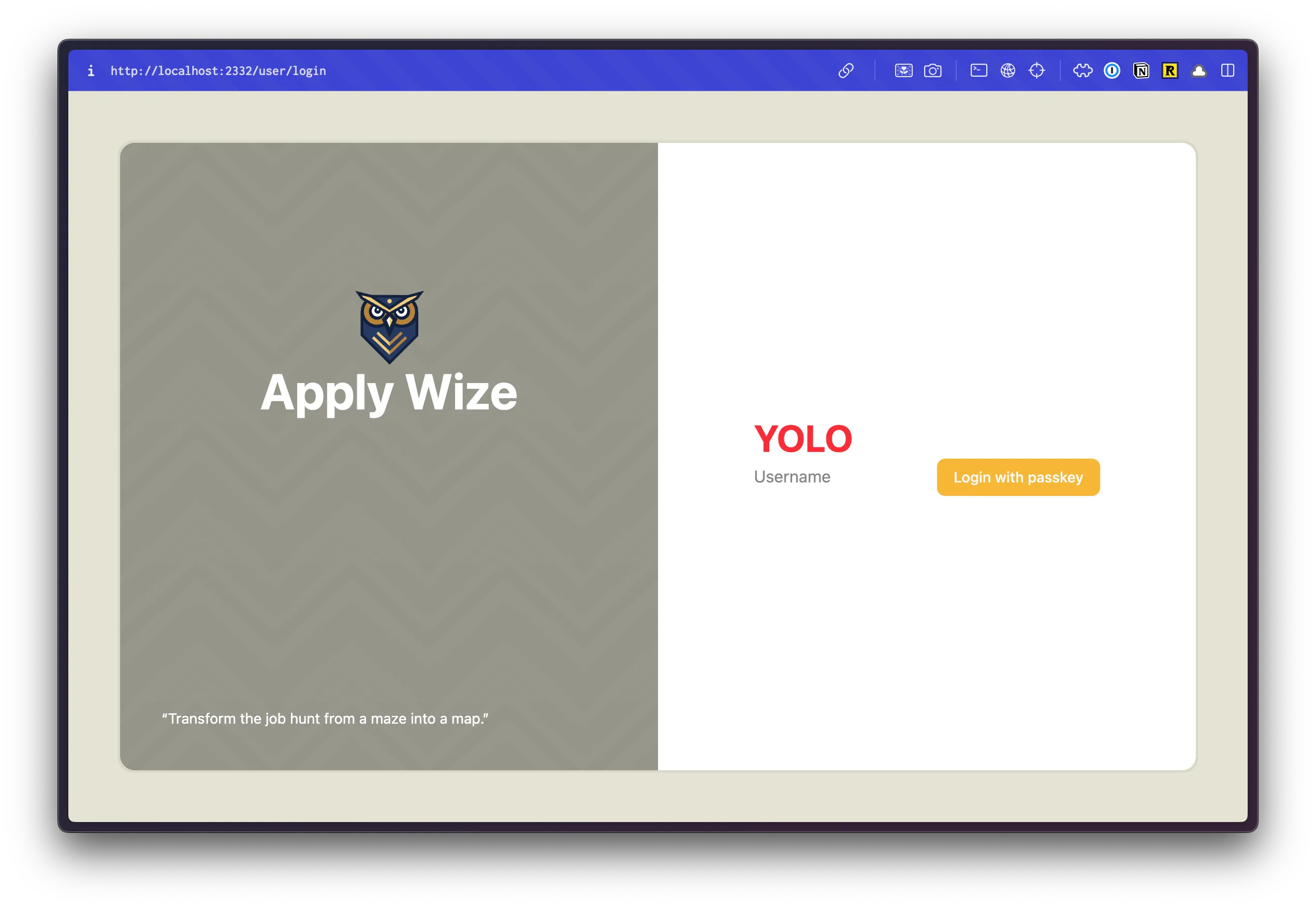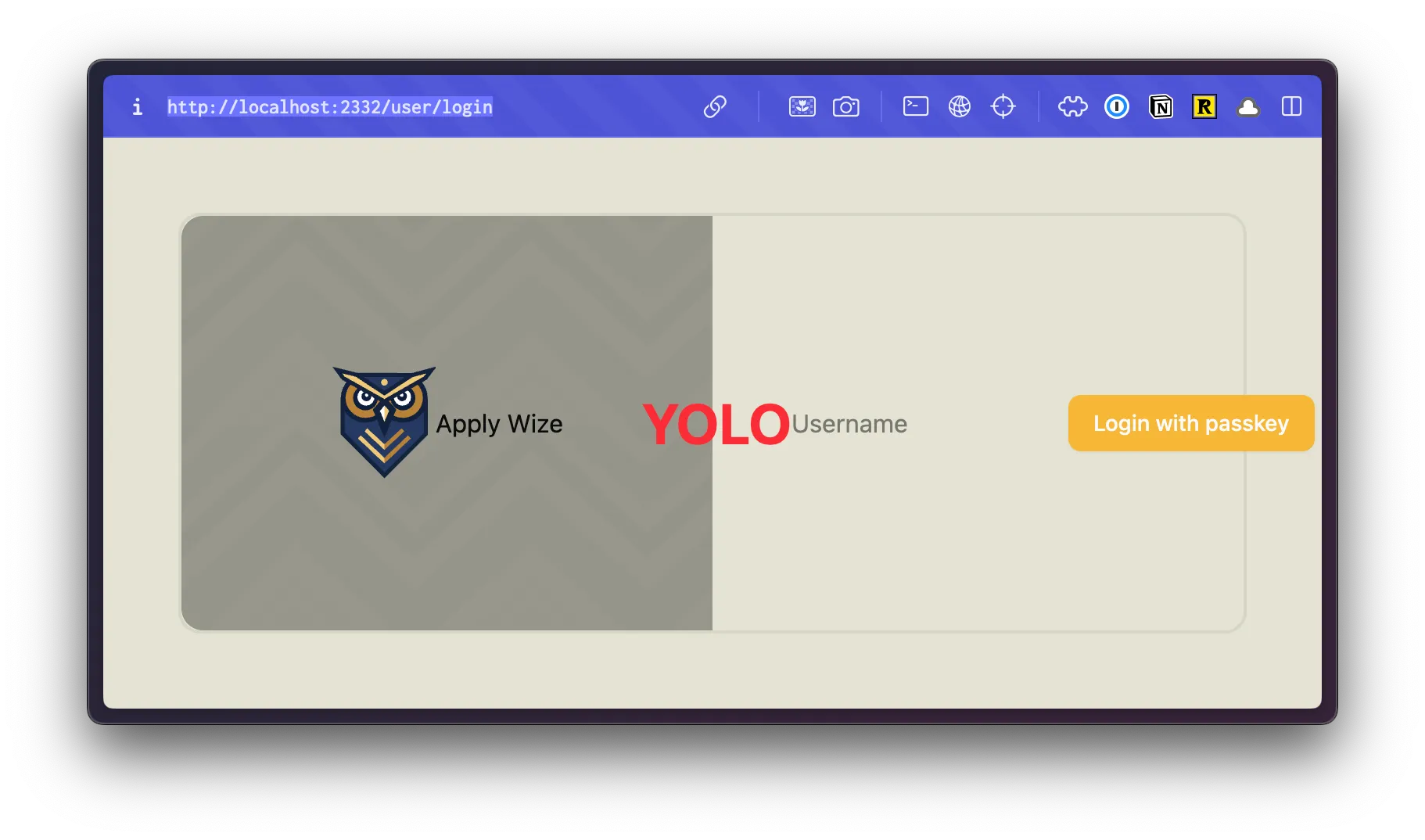 <div className="absolute top-0 right-0 p-10"> <a href={link("/user/login")} className="font-display font-bold text-black text-sm underline underline-offset-8 hover:decoration-primary" > Login </a> </div> <input type="text" value={username} onChange={(e) => setUsername(e.target.value)} placeholder="Username" /> <Button onClick={handlePerformPasskeyRegister} disabled={isPending}> {isPending ? <>...</> : "Register with passkey"} </Button> {result && <div>{result}</div>} </div> </main> );- We're using the same styles as our login page.