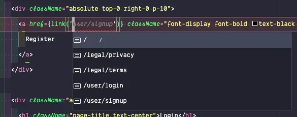 export const link = defineLinks([ "/", "/user/login", "/user/signup", "/user/logout", "/legal/privacy", "/legal/terms",]);Now, let’s go back to our Login component and update our Register link.