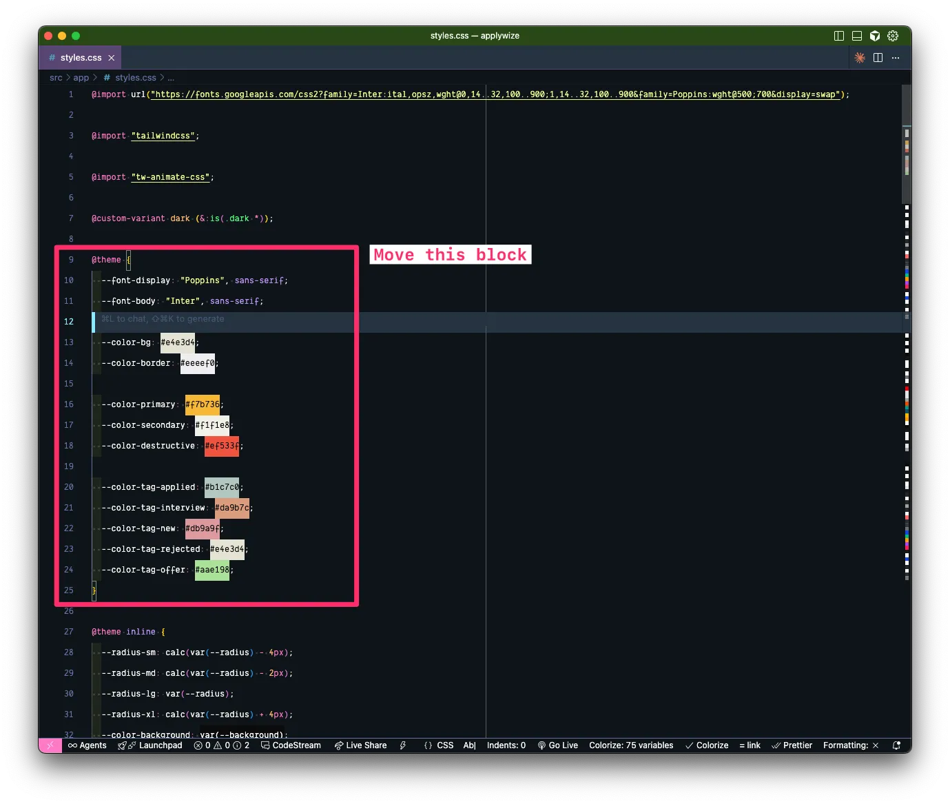 defaultvariant and has a class ofbg-primary. This is why our button is using our yellow, primary color. We've already set--color-primarywithin ourstyles.cssfile.