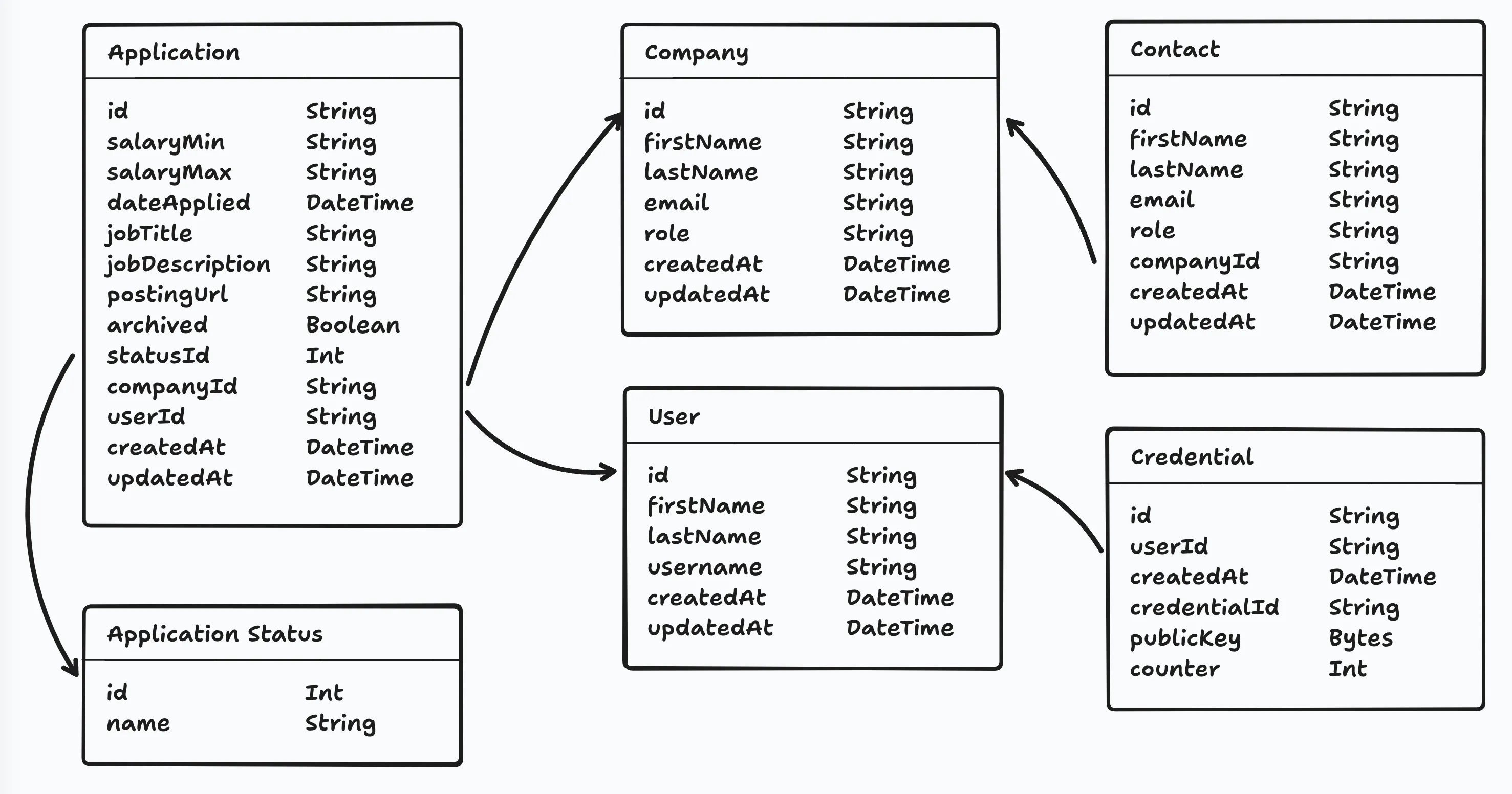 model Application { id String @id @default(uuid()) userId String user User @relation(fields: [userId], references: [id]) status ApplicationStatus @relation(fields: [statusId], references: [id]) statusId Int @default(1) salaryMin String? salaryMax String? dateApplied DateTime? jobTitle String? jobDescription String? postingUrl String? createdAt DateTime @default(now()) updatedAt DateTime? @updatedAt archived Boolean @default(false) companyId String company Company @relation(fields: [companyId], references: [id])}