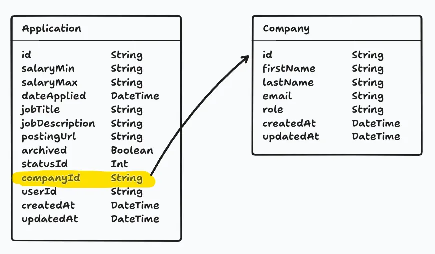 For example, every job application belongs to a specific company, and every company can have multiple job applications associated with it. This creates a relationship between our Application table and Company table. Without relationships, we’d have duplicate information — we’d have to store all the company information (name, address, website) separately in every single application record.