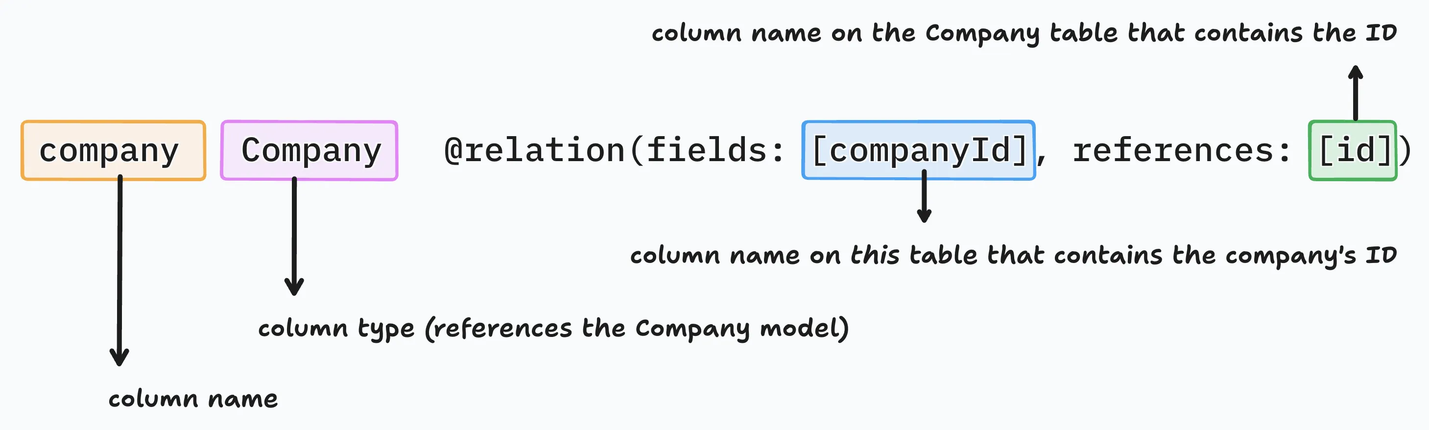 Contactmodel, we added acompanyIdfield. This stores the ID of the relatedCompanyrecord. Because theidfield on theCompanymodel is a string, ourcompanyIdfield is also a string. - On the