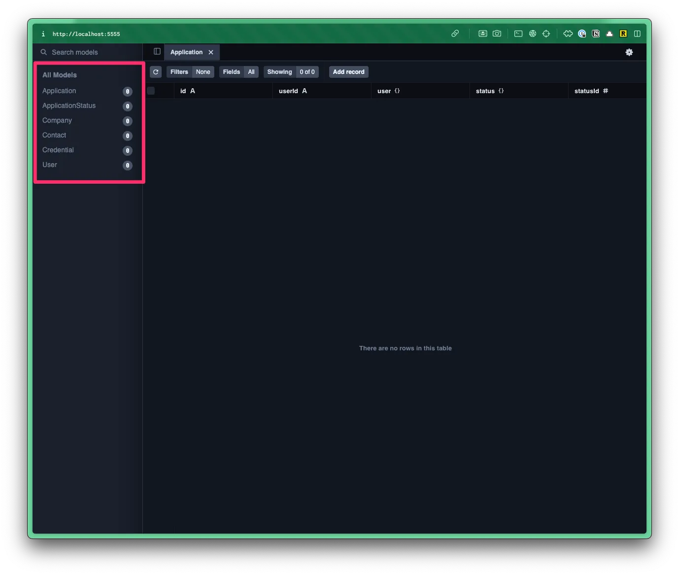 npx prisma studioThis will open a new tab in your default browser at http://localhost:5555.