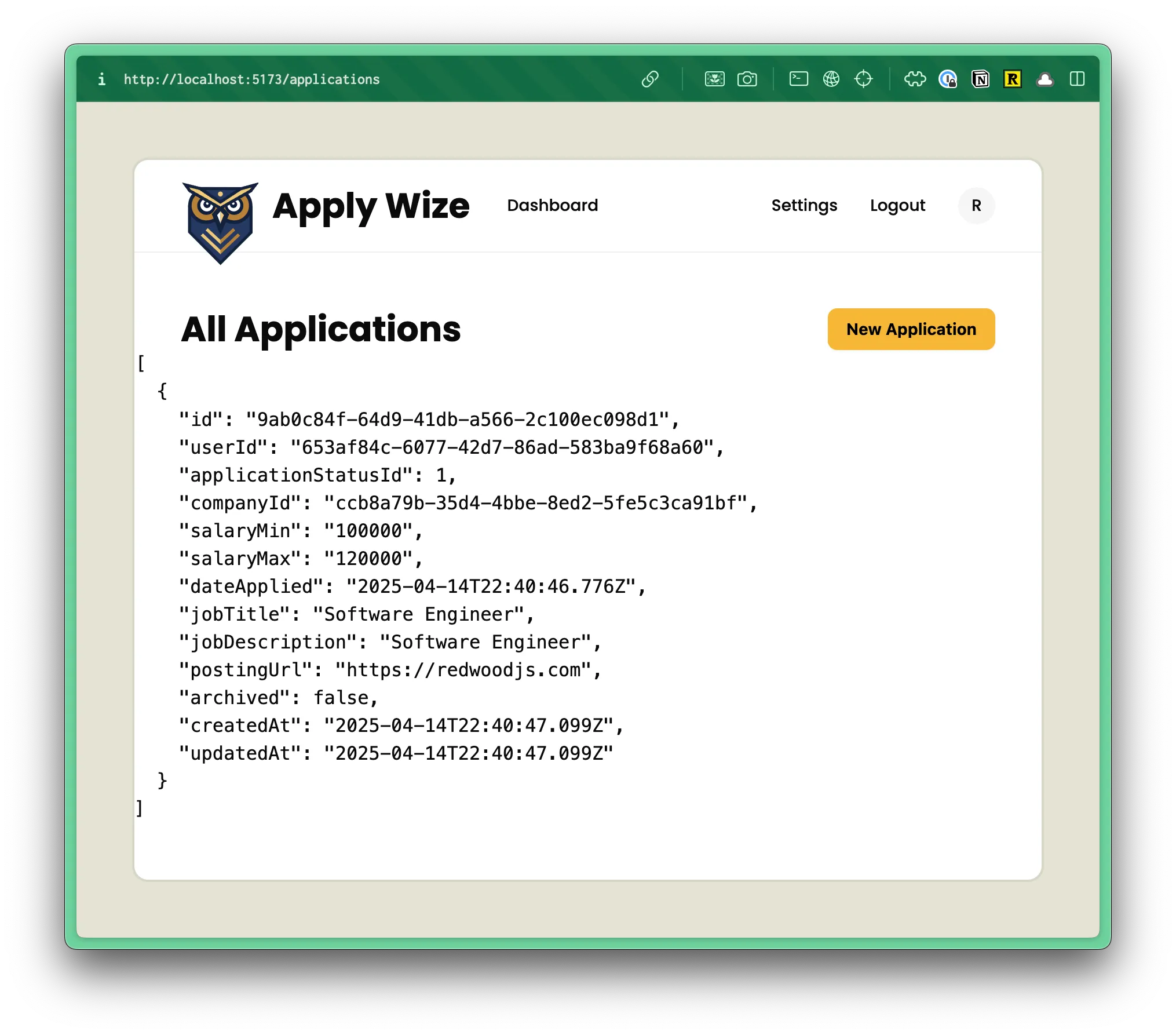 "/", "/user/login", "/user/signup", "/user/logout", "/legal/privacy", "/legal/terms", "/applications", "/applications/:id",]);Perfect. Everything should check out. Try clicking on the view icon in the browser. You should be redirected to a page with an “Application” heading.