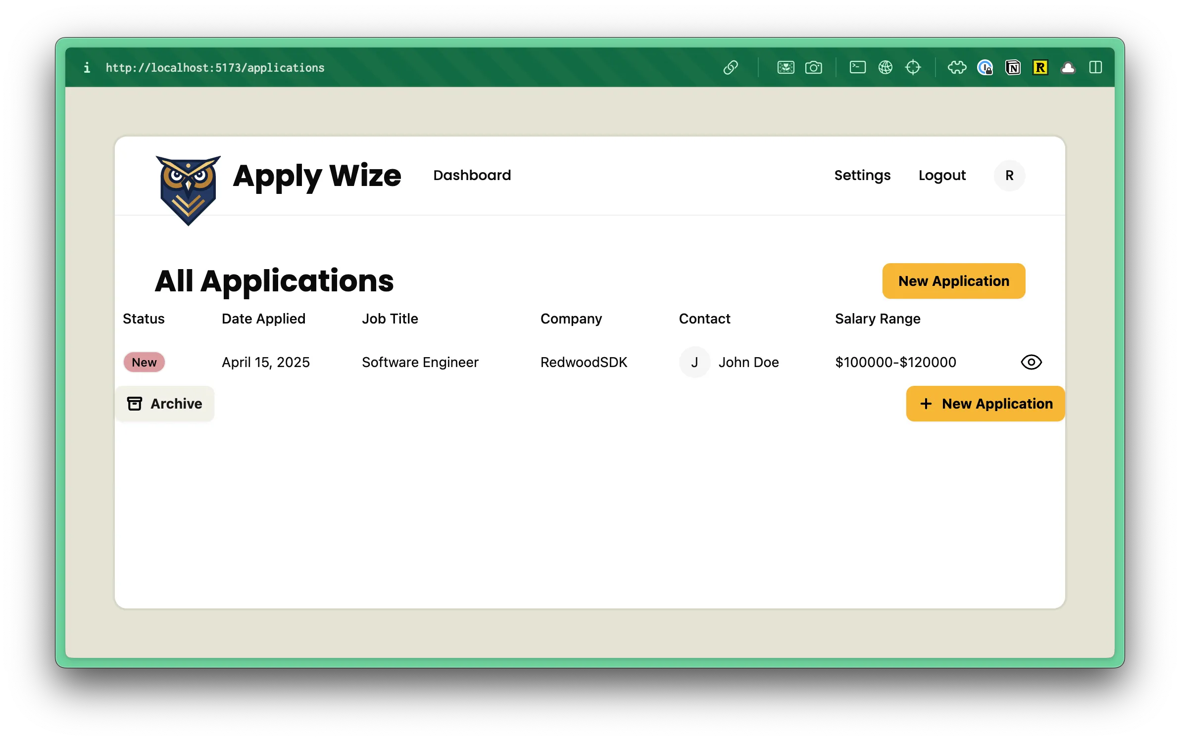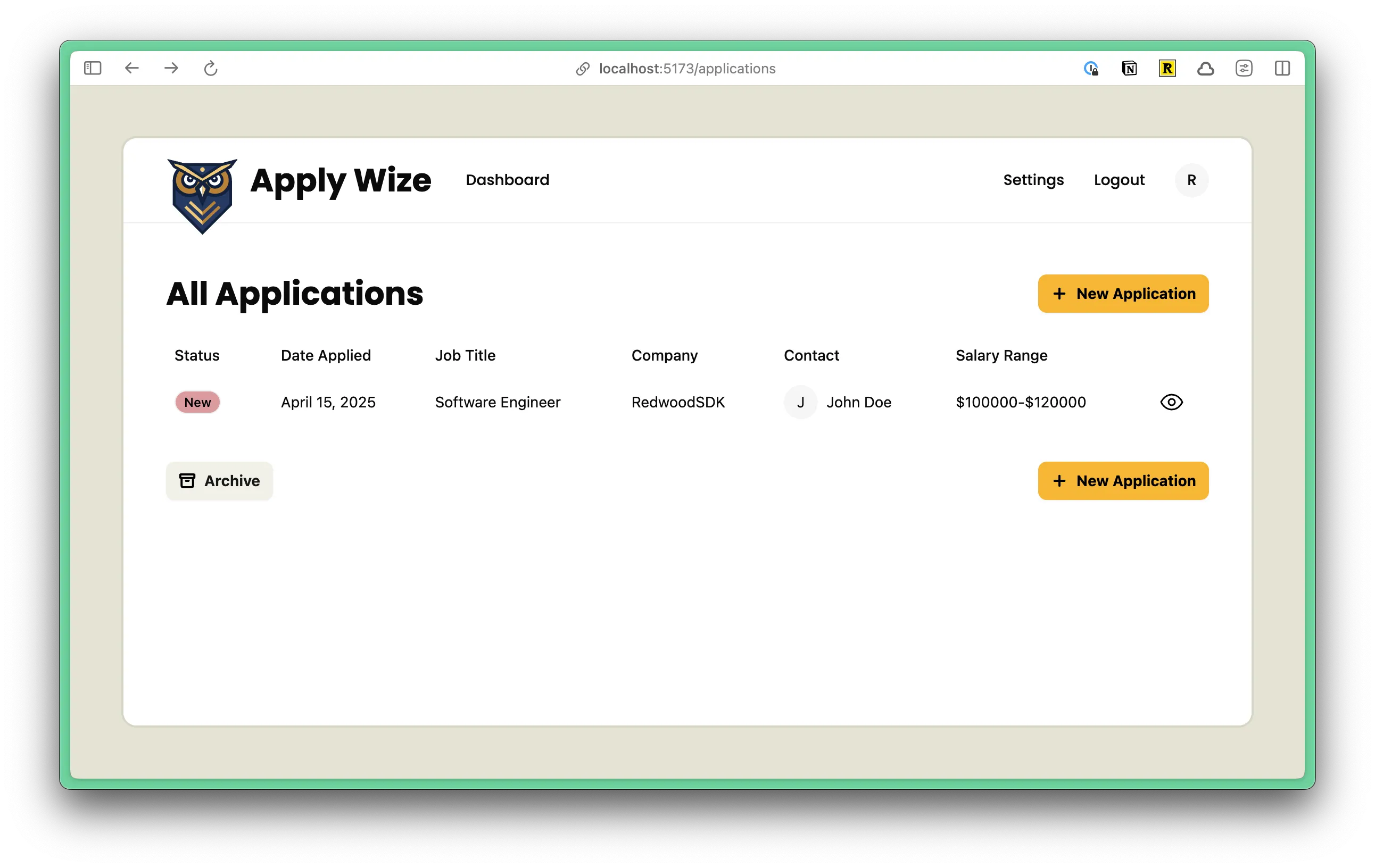return ( <> <div className="px-page-side flex justify-between items-center"> <h1 className="page-title">All Applications</h1> <div> <Button asChild> <a href={link("/applications/new")}> <Icon id="plus" /> New Application </a> </Button> </div> </div> <ApplicationsTable applications={applications} /> <div className="flex justify-between items-center"> <Button asChild variant="secondary"> <a href={`${link("/applications")}?status=archived`}> <Icon id="archive" /> Archive </a> </Button> <Button asChild> <a href={link("/applications/new")}> <Icon id="plus" /> New Application </a> </Button> </div> </>);Now, let’s adjust the spacing around our table. On line 31, we’re using a class of px-page-side to add some padding to the left and right side.