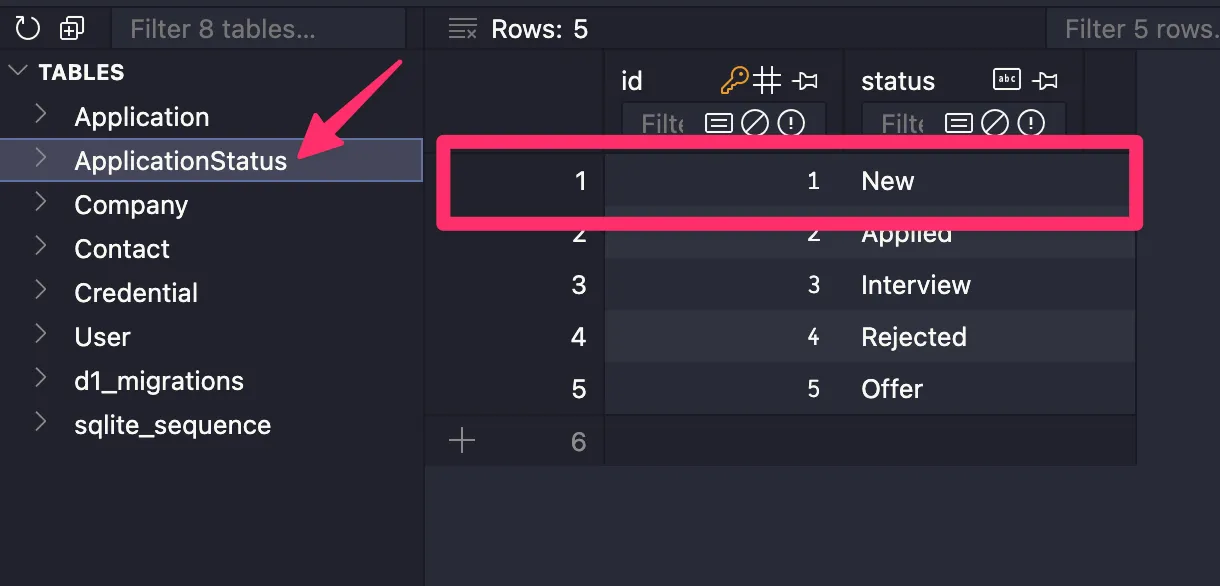 const createApplication = async () => { await db.application.create({ data: { ... user: { connect: { id: "0f9a097c-d7bc-4ab5-8b11-6942163df348", }, }, ...We want to do something similar for the status. If we look at the ApplicationStatus table, you’ll notice that an id of 1 is associated with a New application.