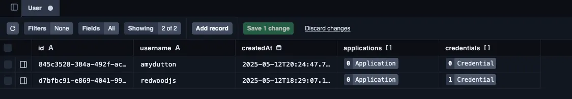 Section titled “Option 2: Prisma Studio”Another option is to use Prisma Studio. This option is easier, but requires manual entry and can take more time in the long run. (We already set up Prisma Studio, here.)