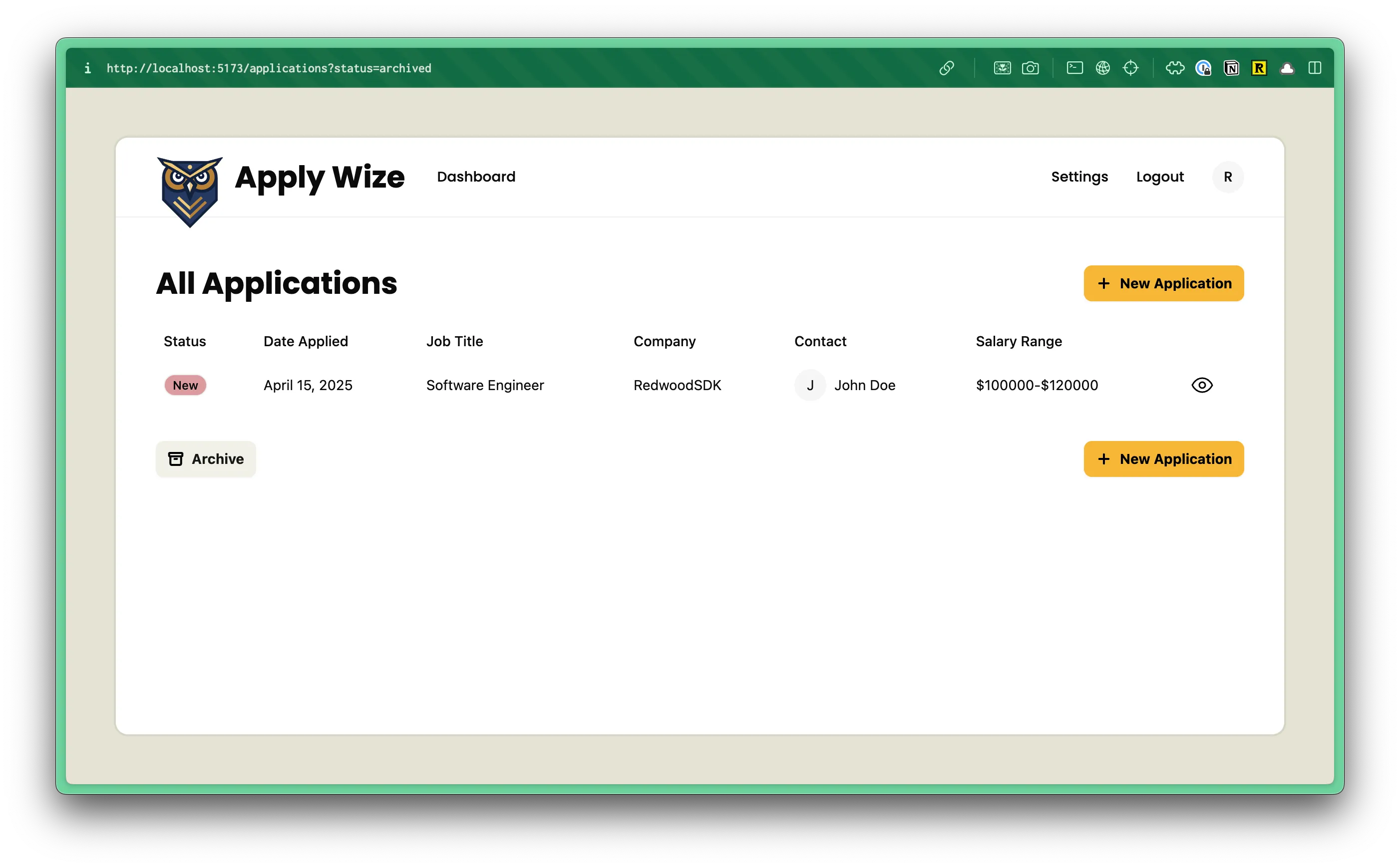 You can test this in the browser, by clicking on the Archive button. You should see the URL change to include /applications?status=archived and the entry applications table should be empty.